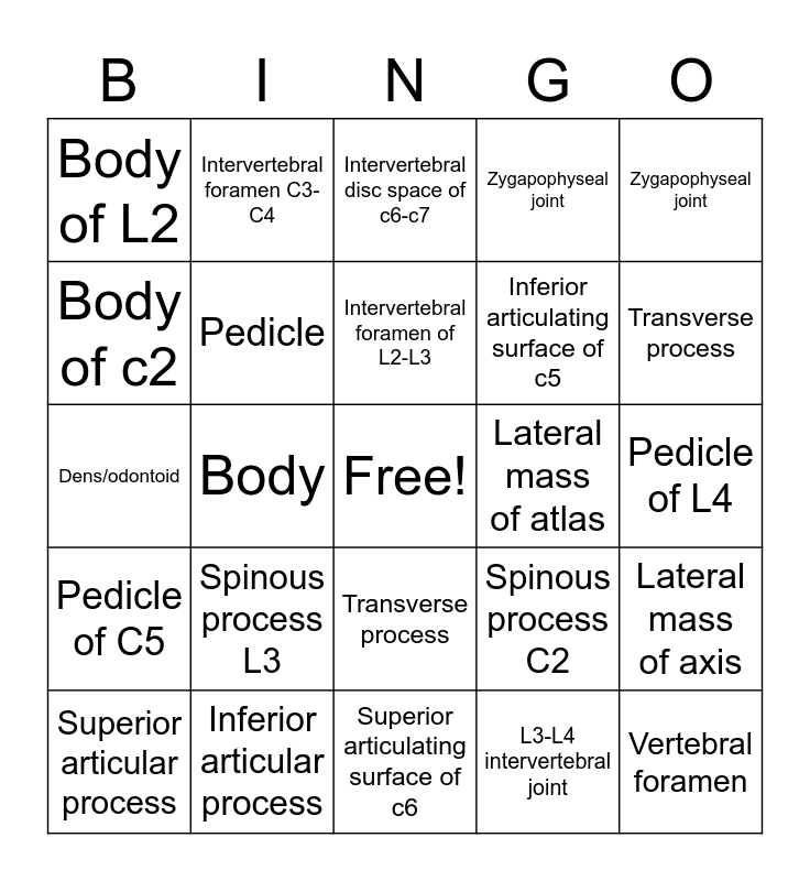 This bingo card has a free space and 27 words: Spinous process C2, Zygapophyseal joint c3/c4, Inferior articulating surface of c5, Superior articulating surface of c6, Body of c2, Intervertebral disc space of c6-c7, Intervertebral foramen C3-C4, Pedicle of C5, Lateral mass of atlas, Lateral mass of axis, Dens/odontoid, Zygapophyseal joint, Superior articular process, Inferior articular process, Transverse process, Zygapophyseal joint, Pedicle, Intervertebral foramen of L2-L3, Spinous process L3, Body of L2, Pedicle of L4, L3-L4 intervertebral joint, Body, Vertebral foramen, Transverse process, Zygapophyseal joint and Spinous process.