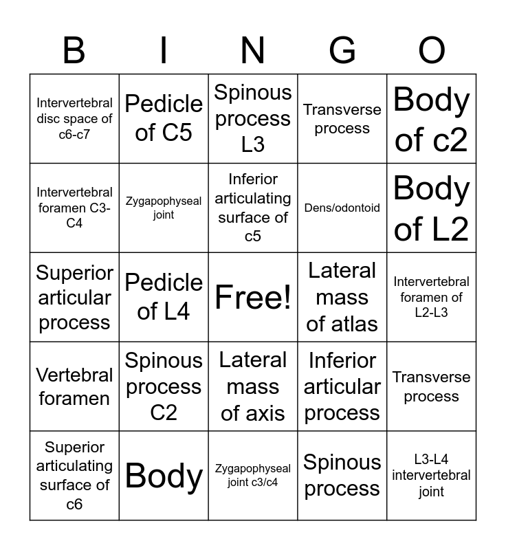 This bingo card has a free space and 25 words: Spinous process C2, Zygapophyseal joint c3/c4, Inferior articulating surface of c5, Superior articulating surface of c6, Body of c2, Intervertebral disc space of c6-c7, Intervertebral foramen C3-C4, Pedicle of C5, Lateral mass of atlas, Lateral mass of axis, Dens/odontoid, Superior articular process, Inferior articular process, Transverse process, Zygapophyseal joint, Pedicle, Intervertebral foramen of L2-L3, Spinous process L3, Body of L2, Pedicle of L4, L3-L4 intervertebral joint, Body, Vertebral foramen, Transverse process and Spinous process.