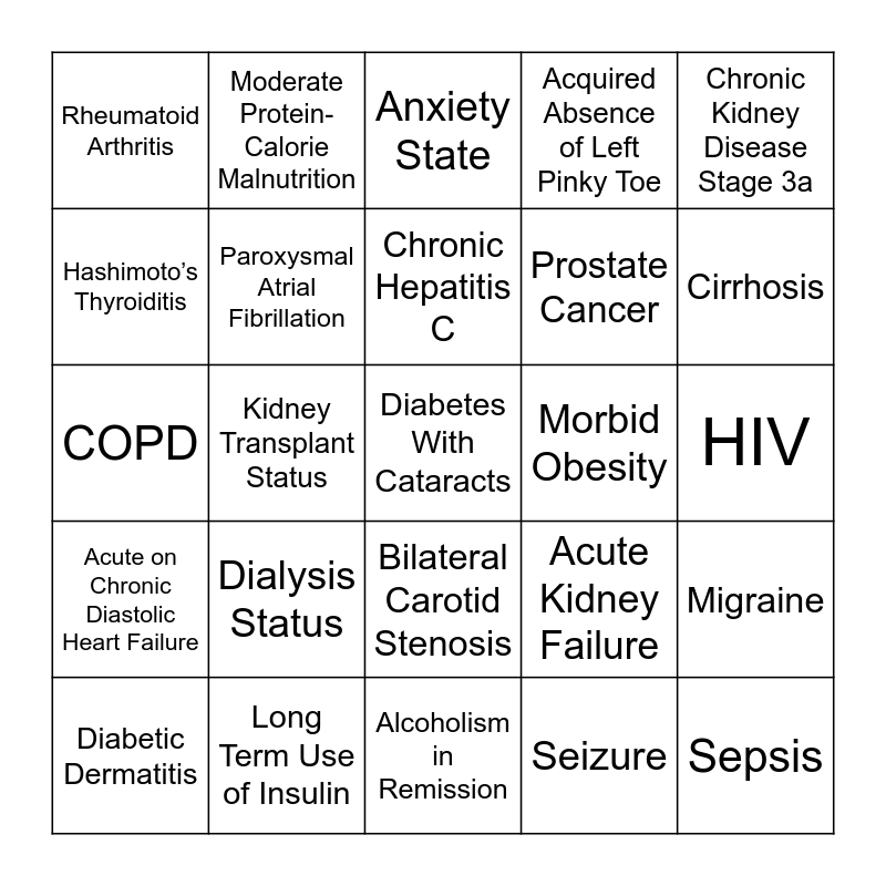 This bingo card has 40 words: Pulmonary Hypertension, COPD, GERD, Paroxysmal Atrial Fibrillation, Long Term Use of Insulin, Bilateral Carotid Stenosis, Chronic Hepatitis C, Old Myocardial Infarction, Chronic Kidney Disease Stage 3a, Acute on Chronic Diastolic Heart Failure, Kidney Transplant Status, Acquired Absence of Left Pinky Toe, Diabetes With Cataracts, HIV, Morbid Obesity, Dialysis Status, Osteoporosis, Rheumatoid Arthritis, Sacroiliitis, Anxiety State, Migraine, Seizure, Prostate Cancer, Hashimoto’s Thyroiditis, Unspecified Mood Disorder, Impulse Control Disorder, Secondary Hyperparathyroidism, Uremia, Sepsis, Pulmonary Fibrosis, CAD, Diabetic Dermatitis, Classical Phenylketonuria, Acute Kidney Failure, Cirrhosis, Alcoholism in Remission, Right Lung Cancer, Drug-Induced Polyneuropathy, Moderate Protein-Calorie Malnutrition and Constitutionalism Gigantism.