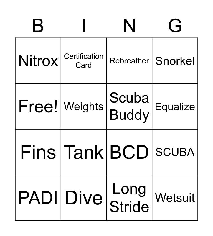 This bingo card has 16 words: Dive, SCUBA, Rebreather, Nitrox, Fins, Certification Card, BCD, Long Stride, Free!, Weights, PADI, Snorkel, Tank, Equalize, Scuba Buddy and Wetsuit.
