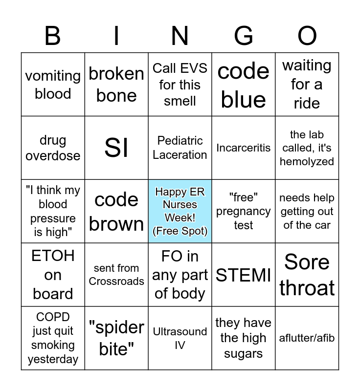 This bingo card has a free space and 39 words: abdominal pain but patient is eating food, chronic joint/back pain, Allergic to everything except dilahlah, SI, COPD just quit smoking yesterday, FO in any part of body, Pediatric Laceration, "they usually have to use a butterfly", waiting for a ride, ETOH on board, code brown, code blue, aflutter/afib, needs help getting out of the car, "free" pregnancy test, sent from Crossroads, nursing home transfer of "Comfort measures only" patient, vomiting blood, Chest pain, STEMI, drug overdose, Ultrasound IV, Incarceritis, the lab called, it's hemolyzed, Inappropriate utilization of EMS, conscious sedation, Stroke alert, dog/cat bite, knee pain, broken bone, it's the rona, MVA, Call EVS for this smell, "spider bite", they have the high sugars, SEPSIS, Sore throat, "I think my blood pressure is high" and Pseudo-seizures.