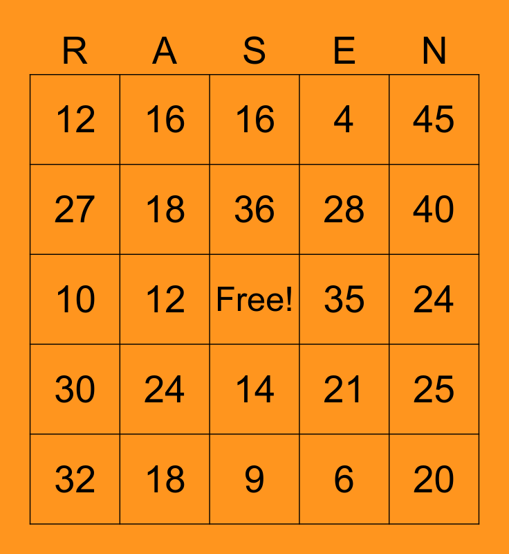 This bingo card has a free space and 24 words: 24, 18, 36, 32, 45, 12, 27, 16, 35, 14, 28, 10, 21, 25, 18, 6, 24, 16, 40, 12, 20, 30, 4 and 9.