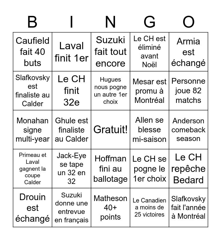 This bingo card has a free space and 24 words: Drouin est échangé, Jack-Eye se tape un 32 en 32, Hugues nous pogne un autre 1er choix, Le Canadien a moins de 25 victoires, Armia est échangé, Caufield fait 40 buts, Laval finit 1er, Suzuki fait tout encore, Allen se blesse mi-saison, Anderson comeback season, Monahan signe multi-year, Le CH finit 32e, Le CH se pogne le 1er choix, Le CH repêche Bedard, Slafkovsky est finaliste au Calder, Suzuki donne une entrevue en français, Matheson 40+ points, Le CH est éliminé avant Noël, Personne joue 82 matchs, Primeau et Laval gagnent la coupe Calder, Ghule est finaliste au Calder, Hoffman fini au ballotage, Mesar est promu à Montréal and Slafkovsky fait l'année à Montréal.