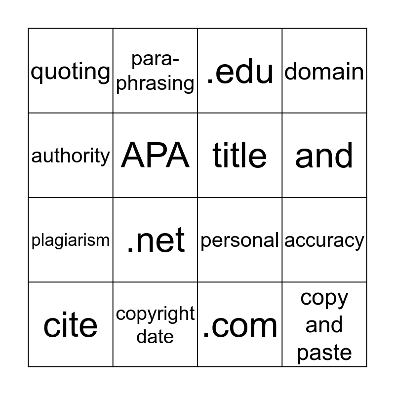 This bingo card has 16 words: copyright date, accuracy, .edu, quoting, plagiarism, para- phrasing, personal, .com, authority, APA, cite, domain, .net, and, title and copy and paste.