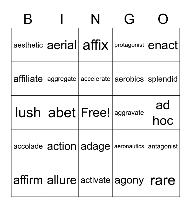 This bingo card has a free space and 24 words: action, allure, accelerate, affirm, enact, aesthetic, affiliate, aerial, aggravate, adage, aerobics, lush, aeronautics, antagonist, aggregate, agony, ad hoc, affix, splendid, abet, rare, accolade, protagonist and activate.