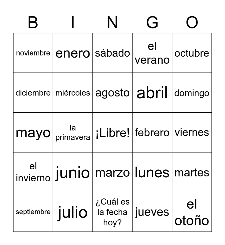 This bingo card has a free space and 24 words: junio, julio, agosto, septiembre, octubre, noviembre, diciembre, enero, febrero, marzo, abril, mayo, lunes, martes, miércoles, jueves, viernes, sábado, domingo, la primavera, el otoño, el invierno, el verano and ¿Cuál es la fecha hoy?.
