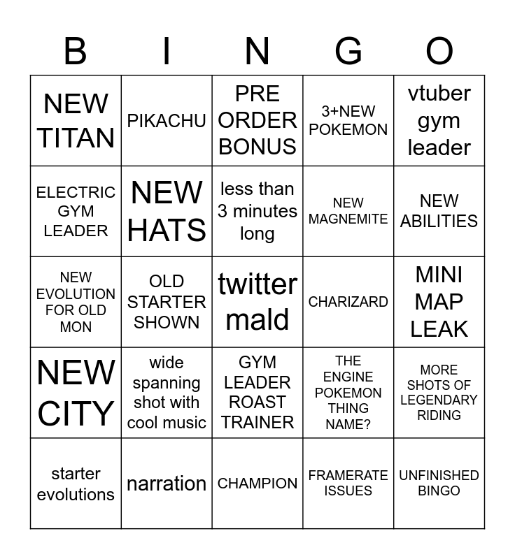 This bingo card has a free space and 24 words: wide spanning shot with cool music, narration, less than 3 minutes long, starter evolutions, vtuber gym leader, NEW TITAN, ELECTRIC GYM LEADER, PIKACHU, CHARIZARD, GYM LEADER ROAST TRAINER, NEW MAGNEMITE, NEW EVOLUTION FOR OLD MON, THE ENGINE POKEMON THING NAME?, MORE SHOTS OF LEGENDARY RIDING, NEW HATS, FRAMERATE ISSUES, MINI MAP LEAK, PRE ORDER BONUS, NEW ABILITIES, OLD STARTER SHOWN, UNFINISHED BINGO, NEW CITY, 3+NEW POKEMON and CHAMPION.