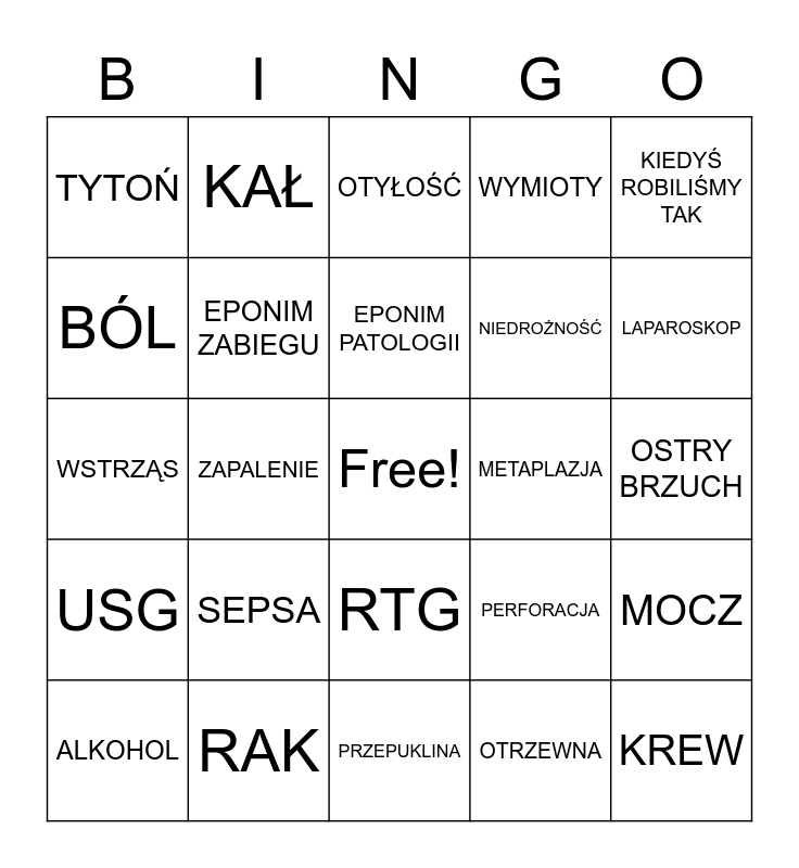 This bingo card has a free space and 25 words: SEPSA, PRZEPUKLINA, EPONIM PATOLOGII, ALKOHOL, KIEDYŚ ROBILIŚMY TAK, TYTOŃ, BÓL, KAŁ, METAPLAZJA, RTG, NIEDROŻNOŚĆ, WSTRZĄS, PERFORACJA, MOCZ, EPONIM ZABIEGU, MORFOLOGIA, OSTRY BRZUCH, OTYŁOŚĆ, LAPAROSKOP, ZAPALENIE, KREW, RAK, USG, WYMIOTY and OTRZEWNA.