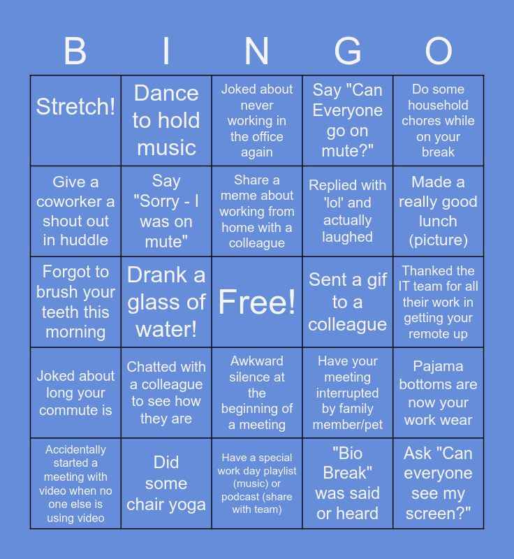 This bingo card has a free space and 29 words: Say "Can you hear me?", Did some chair yoga, Joked about never working in the office again, Talked out loud to yourself, Do some household chores while on your break, Stretch!, Say "Sorry - I was on mute", Share a meme about working from home with a colleague, Sent a gif to a colleague, Pajama bottoms are now your work wear, Accidentally started a meeting with video when no one else is using video, Drank a glass of water!, "Bio Break" was said or heard, Ask "Can everyone see my screen?", Forgot to brush your teeth this morning, Made a really good breakfast (picture), Have a special work day playlist (music) or podcast (share with team), Have your meeting interrupted by family member/pet, Made a really good lunch (picture), Joked about long your commute is, Chatted with a colleague to see how they are, Zoom Dropped you from a call, Replied with 'lol' and actually laughed, Thanked the IT team for all their work in getting your remote up, Give a coworker a shout out in huddle, Dance to hold music, Awkward silence at the beginning of a meeting, Say "Can Everyone go on mute?" and Saw something interesting in a co-workers background.
