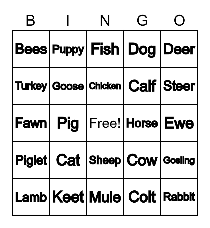 This bingo card has a free space and 39 words: Goat, Duck, Guinea, Goose, Lamb, Sheep, Chicken, Squirrel, Deer, Piglet, Pig, Dog, Rabbit, Ewe, Horse, Cat, Donkey, Bees, Capon, Cow, Turkey, Mule, Calf, Steer, Ram, Kid, Foal, Duckling, Chicks, Puppy, Kitten, Poults, Fish, Keet, Colt, Filly, Gosling, Fawn and Brood.