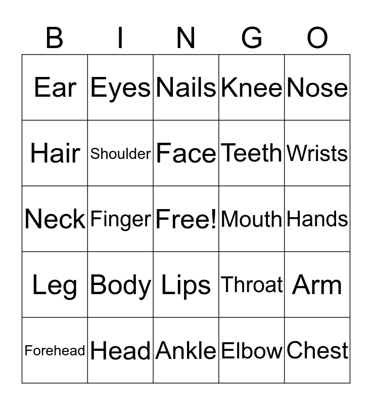 This bingo card has a free space and 24 words: Body, Head, Face, Forehead, Nose, Ear, Hair, Eyes, Mouth, Lips, Teeth, Neck, Throat, Arm, Shoulder, Elbow, Hands, Nails, Wrists, Finger, Chest, Leg, Knee and Ankle.