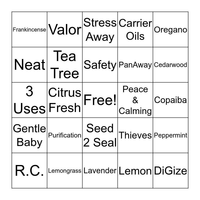 This bingo card has a free space and 24 words: Purification, Lemongrass, Safety, R.C., Oregano, Frankincense, Neat, Valor, Peace & Calming, Seed 2 Seal, PanAway, 3 Uses, Thieves, Peppermint, Tea Tree, Lemon, Copaiba, Stress Away, Cedarwood, Citrus Fresh, DiGize, Gentle Baby, Carrier Oils and Lavender.