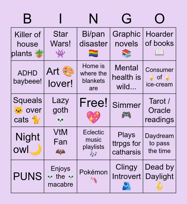 This bingo card has a free space and 24 words: VtM Fan ๐ฆ, Enjoys ๐ the ๐ macabre, Home is where the blankets are, PUNS, Hoarder of books ๐, Killer of house plants ๐ชด, ADHD baybeee!, Star Wars! ๐พ, Simmer ๐ฎ, Eclectic music playlists ๐ถ, Mental health is wild..., Squeals ๐ฑ over cats ๐, Plays ttrpgs for catharsis, Daydream to pass the time, Art ๐จ lover!, Clingy Introvert ๐ซ, Tarot / Oracle readings, Bi/pan disaster ๐ณ๏ธโ๐, Consumer ๐ฆ of ๐ฆ ice-cream, Lazy goth ๐, Dead by Daylight ๐ช, Night owl๐, Graphic novels ๐ and Pokรฉmon ๐ฆ.