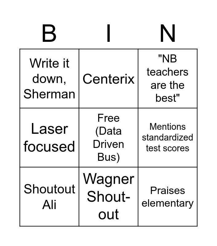 This bingo card has a free space and 8 words: Mentions standardized test scores, "NB teachers are the best", Centerix, Shoutout Ali, Write it down, Sherman, Praises elementary, Laser focused and Wagner Shout-out.