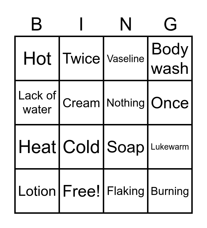 This bingo card has 16 words: Free!, Lukewarm, Vaseline, Hot, Heat, Twice, Soap, Flaking, Lack of water, Cream, Lotion, Body wash, Cold, Once, Nothing and Burning.