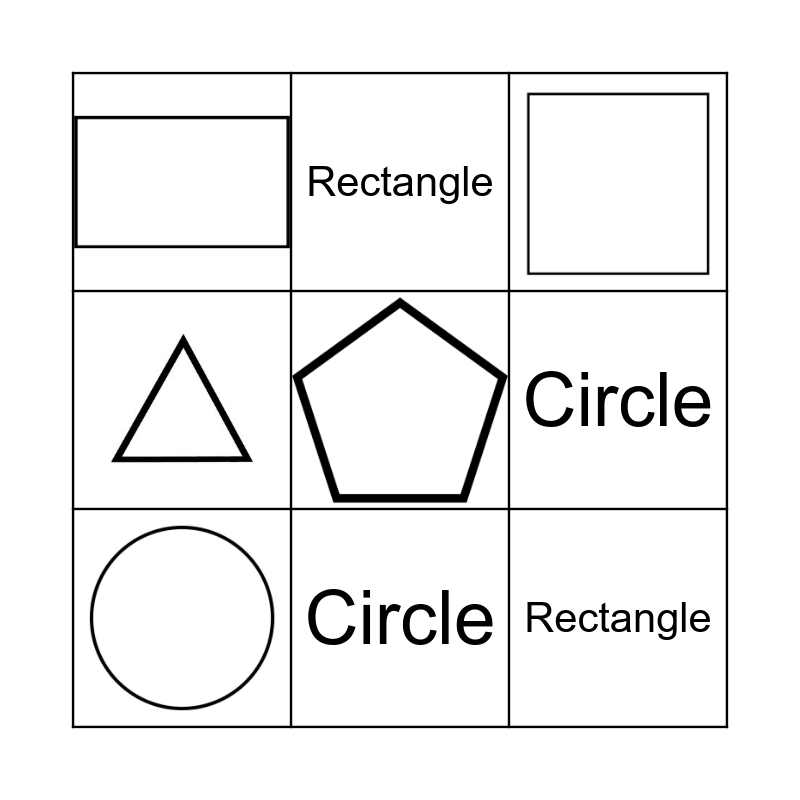 This bingo card has 8 images, a free space and 9 words: Circle, Circle, Triangle, Triangle, Rectangle, Rectangle, Square, Pentagon and Hexagon.