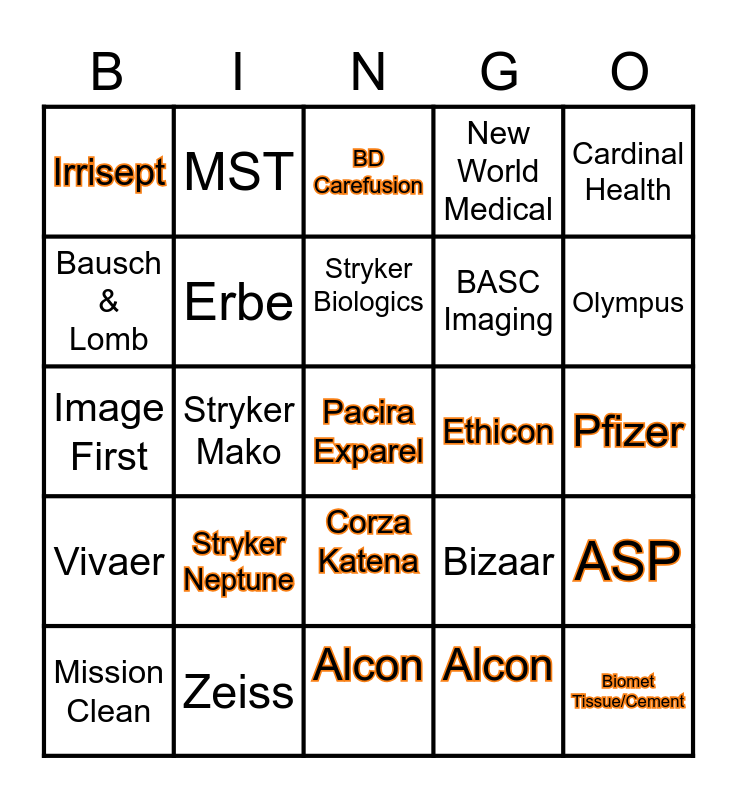 This bingo card has a free space and 24 words: Stryker Neptune, Zeiss, Stryker Biologics, Mission Clean, Cardinal Health, Irrisept, Bausch & Lomb, MST, Ethicon, Corza Katena, BASC Imaging, Image First, Bizaar, ASP, Erbe, Alcon, Pfizer, BD Carefusion, Olympus, Stryker Mako, Biomet Tissue/Cement, Vivaer, New World Medical and Alcon.