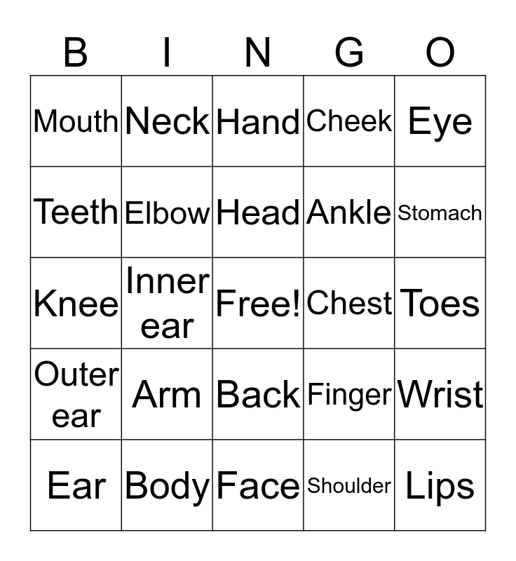 This bingo card has a free space and 24 words: Arm, Body, Head, Ear, Eye, Mouth, Teeth, Neck, Chest, Back, Ankle, Knee, Finger, Wrist, Elbow, Shoulder, Toes, Hand, Stomach, Inner ear, Lips, Outer ear, Cheek and Face.