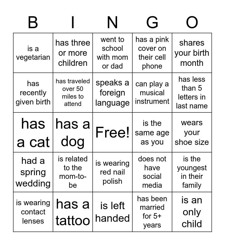 This bingo card has a free space and 24 words: is related to the mom-to-be, has a tattoo, speaks a foreign language, is wearing contact lenses, shares your birth month, is a vegetarian, has recently given birth, has three or more children, is the same age as you, is wearing red nail polish, can play a musical instrument, has a cat, does not have social media, is the youngest in their family, has traveled over 50 miles to attend, has been married for 5+ years, wears your shoe size, went to school with mom or dad, has less than 5 letters in last name, has a dog, is an only child, had a spring wedding, has a pink cover on their cell phone and is left handed.