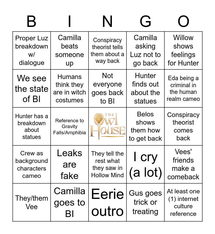 This bingo card has a free space and 24 words: Leaks are fake, Camilla goes to BI, Not everyone goes back to BI, They/them Vee, Willow shows feelings for Hunter, Proper Luz breakdown w/ dialogue, We see the state of BI, Camilla beats someone up, Belos shows them how to get back, They tell the rest what they saw in Hollow Mind, Hunter finds out about the statues, Hunter has a breakdown about statues, I cry (a lot), Vees' friends make a comeback, Humans think they are in witch costumes, Gus goes trick or treating, Conspiracy theorist comes back, Conspiracy theorist tells them about a way back, Eda being a criminal in the human realm cameo, Reference to Gravity Falls/Amphibia, At least one (1) internet culture reference, Crew as background characters cameo, Camilla asking Luz not to go back and Eerie outro.