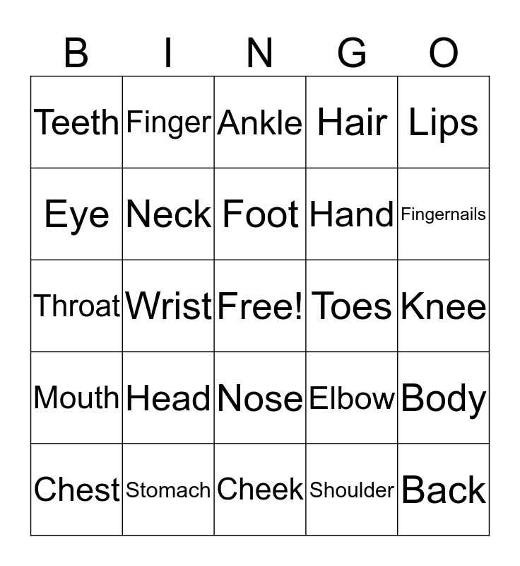 This bingo card has a free space and 24 words: Head, Stomach, Foot, Chest, Lips, Teeth, Eye, Finger, Toes, Nose, Hand, Throat, Elbow, Body, Neck, Shoulder, Knee, Ankle, Fingernails, Wrist, Back, Mouth, Hair and Cheek.