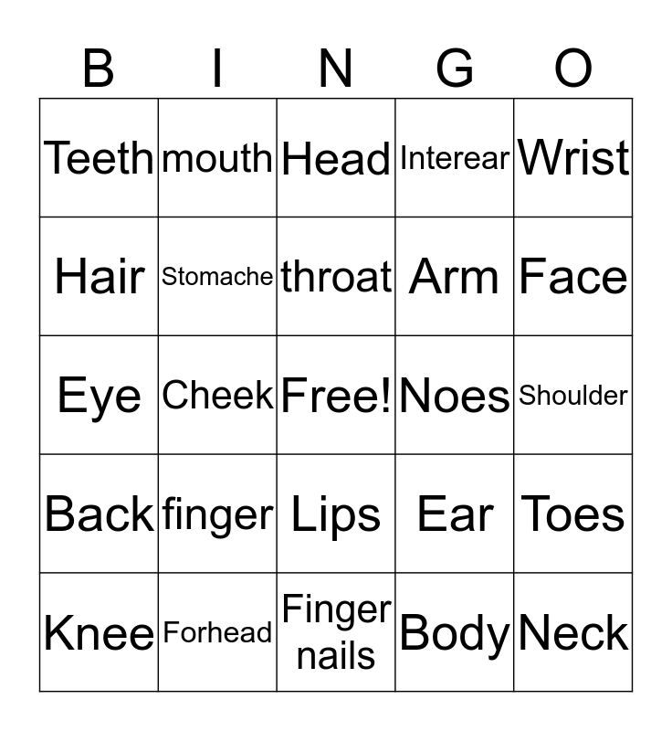 This bingo card has a free space and 24 words: finger, Forhead, throat, Knee, Wrist, Teeth, Hair, mouth, Noes, Lips, Arm, Eye, Ear, Toes, Stomache, Body, Shoulder, Head, Face, Cheek, Neck, Back, Interear and Finger nails.