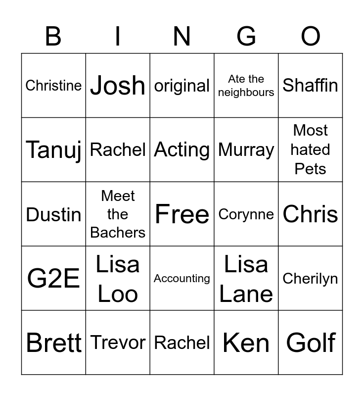 This bingo card has a free space and 24 words: Lisa Loo, Trevor, Acting, Brett, Shaffin, Christine, Tanuj, Josh, Corynne, Accounting, Murray, Dustin, Lisa Lane, Cherilyn, Rachel, Ken, Chris, original, Most hated Pets, Meet the Bachers, Golf, G2E, Ate the neighbours and Rachel.