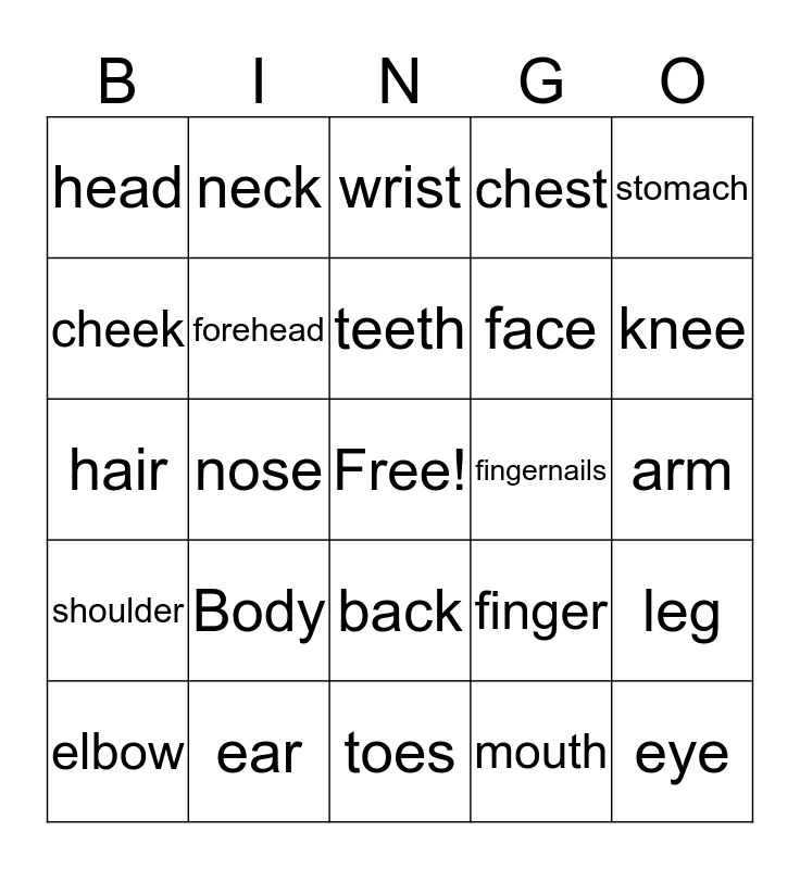 This bingo card has a free space and 24 words: Body, ear, teeth, elbow, stomach, head, cheek, neck, fingernails, back, face, hair, finger, leg, forehead, mouth, arm, wrist, knee, nose, eye, shoulder, chest and toes.