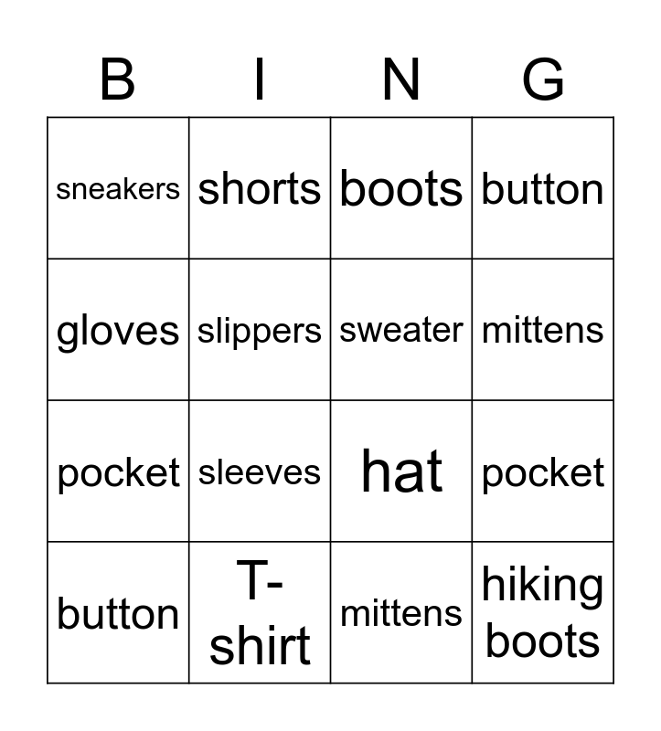 This bingo card has 22 words: T-shirt, coat, shorts, swimsuit, slippers, sweater, sneakers, boots, hat, hiking boots, pocket, button, sleeves, gloves, mittens, scarf, pocket, button, sleeves, gloves, mittens and scarf.