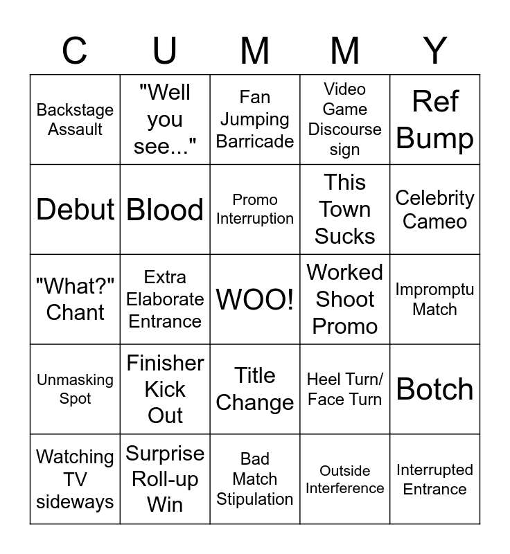 This bingo card has a free space and 24 words: Finisher Kick Out, Surprise Roll-up Win, Promo Interruption, Watching TV sideways, Ref Bump, Backstage Assault, Debut, "Well you see...", Worked Shoot Promo, Title Change, This Town Sucks, "What?" Chant, Heel Turn/ Face Turn, Botch, Blood, Outside Interference, Impromptu Match, Fan Jumping Barricade, Celebrity Cameo, Extra Elaborate Entrance, Interrupted Entrance, Unmasking Spot, Video Game Discourse sign and Bad Match Stipulation.