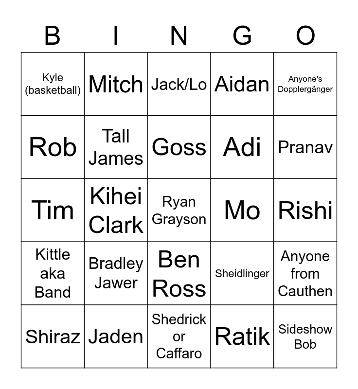 This bingo card has a free space and 24 words: Bradley Jawer, Jaden, Goss, Shiraz, Anyone's Dopplergänger, Kyle (basketball), Rob, Mitch, Mo, Ben Ross, Adi, Tim, Sheidlinger, Anyone from Cauthen, Tall James, Ratik, Rishi, Jack/Lo, Pranav, Kihei Clark, Sideshow Bob, Kittle aka Band, Aidan and Shedrick or Caffaro.