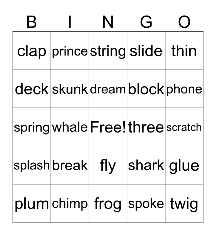 This bingo card has a free space and 24 words: break, chimp, dream, plum, thin, clap, deck, prince, three, fly, block, spring, shark, glue, skunk, spoke, scratch, string, phone, whale, twig, splash, slide and frog.