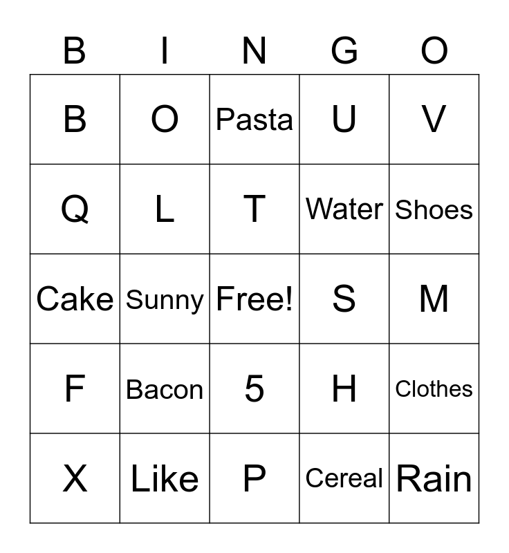 This bingo card has a free space and 73 words: A B C D E F G H I J K L M N O P Q R S T U V W X Y Z Spider Fall Summer Like Spring Penguin Snake Sunny Winter Jellyfish Tornado Rain Snow Cereal Bacon Milk French fry Sandwich Water Pasta Salad Soda, A, B, C, D, E, F, G, H, I, J, K, L, M, N, O, P, Q, R, S, T, U, V, W, X, Y, Z, Spider, Fall, Summer, Like, Spring, Penguin, Snake, Sunny, Winter, Jellyfish, Tornado, Rain, Snow, Cereal, Bacon, Milk, French fry, Sandwich, Water, Pasta, Salad, Soda, Cake, 20, 18, 16, 15, 12, 10, 9, 5, 3, 2, 1, Pants, Shirt, Shoes, Tie, Coat, Hat, Glasses, Clothes, Necklace, Belt, like and dislike.