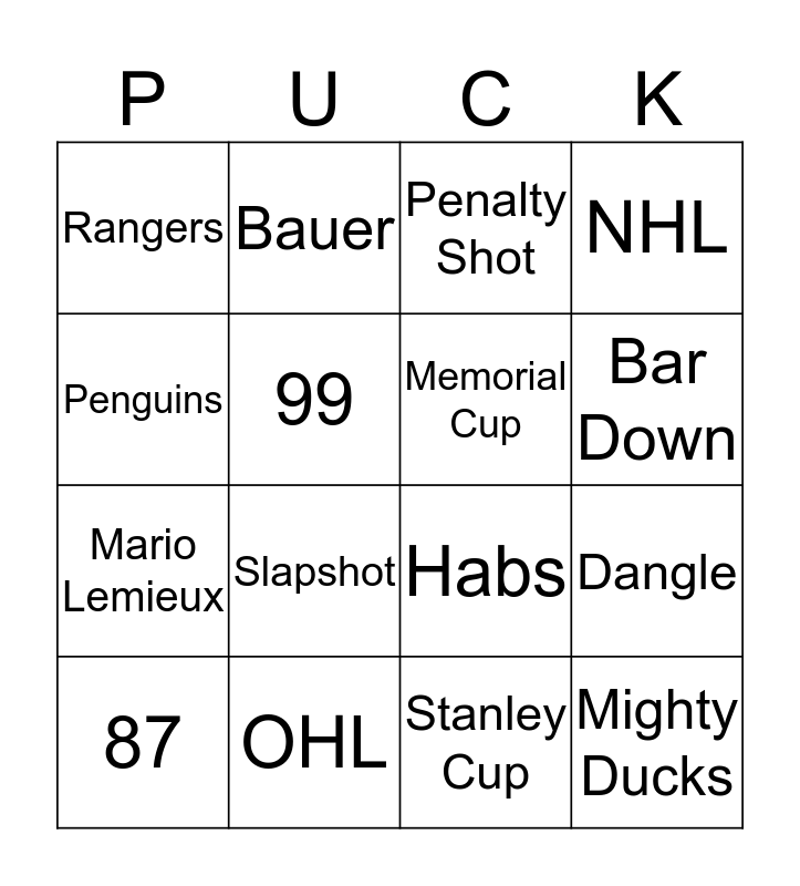 This bingo card has a free space and 15 words: 87, Mighty Ducks, Penalty Shot, Rangers, Bar Down, Penguins, Slapshot, Stanley Cup, 99, Mario Lemieux, Dangle, NHL, Memorial Cup, Bauer and OHL.