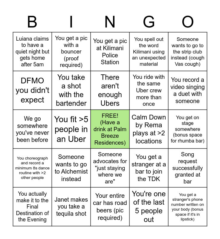 This bingo card has a free space and 24 words: Someone wants to go to Alchemist instead, Janet makes you take a tequila shot, There aren't enough Ubers, You actually make it to the Final Destination of the Evening, Someone wants to go to the strip club instead (cough Vas cough), Luiana claims to have a quiet night but gets home after 5am, DFMO you didn't expect, You get a pic with a bouncer (proof required), Calm Down by Rema plays at >2 locations, Someone advocates for "just staying where we are", You ride with the same Uber crew more than once, We go somewhere you've never been before, You get a stranger at a bar to join the TDK, Song request successfully granted at bar, You take a shot with the bartender, You're one of the last 5 people out, You get on stage somewhere (bonus space for rhumba bar), You get a pic at Kilimani Police Station, You record a video singing a duet with someone, You fit >5 people in an Uber, You get a stranger's phone number written on your body (bonus space if it's in lipstick), You choreograph and record a minimum 8s dance routine with >2 other people, You spell out the word Kilimani using an unexpected material and Your entire car has road beers (pic required).