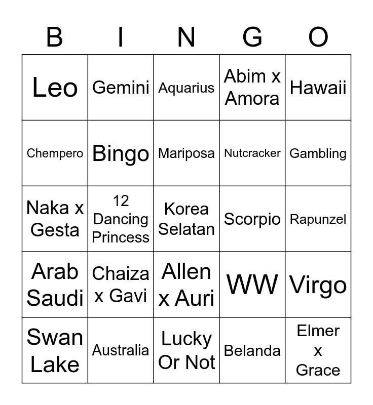 This bingo card has 25 words: Arab Saudi, Australia, Korea Selatan, Belanda, Hawaii, Leo, Gemini, Aquarius, Scorpio, Virgo, Chempero, Bingo, Lucky Or Not, WW, Gambling, Swan Lake, 12 Dancing Princess, Mariposa, Nutcracker, Rapunzel, Naka x Gesta, Chaiza x Gavi, Allen x Auri, Abim x Amora and Elmer x Grace.
