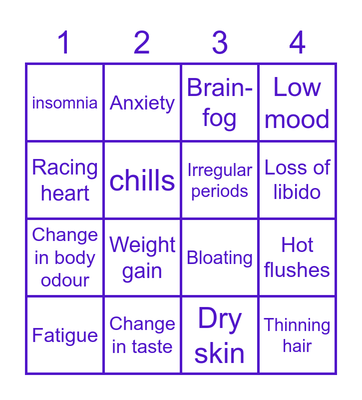 This bingo card has 20 words: Hot flushes, Mood Swings, Brain-fog, Brain-fog, Fatigue, Racing heart, Change in taste, insomnia, Change in body odour, Anxiety, Weight gain, Bloating, chills, Thinning hair, Irregular periods, Night sweats, Loss of libido, Low mood, Dry skin and Depression.