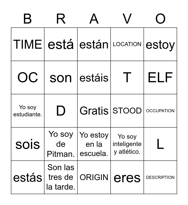 This bingo card has a free space and 34 words: soy, eres, es, somos, sois, son, estoy, estás, está, estamos, estáis, están, SER, ESTAR, STOOD, ELF, Son las tres de la tarde., Yo soy estudiante., Yo soy de Pitman., Yo soy inteligente y atlético., Yo estoy en la escuela., Yo estoy cansada y ocupada., TIME, OCCUPATION, ORIGIN, DESCRIPTION, LOCATION, FEELINGS, T, OC, OR, D, L and F.