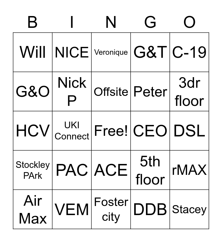 This bingo card has a free space and 30 words: VEM, Annual leave, UKI Connect, UKILT, Will, Veronique, Nick P, ACE, CEO, Foster city, DSL, Stacey, DDB, OAR, 3dr floor, 4th floor, 5th floor, Stockley PArk, PAC, C-19, HCV, HDV, NICE, Peter, G&O, G&T, rMAX, Air Max, Offsite and Marsha.