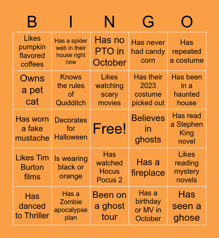 This bingo card has a free space and 24 words: Is wearing black or orange, Has a Zombie apocalypse plan, Likes watching scary movies, Has danced to Thriller, Has repeated a costume, Likes pumpkin flavored coffees, Owns a pet cat, Has a spider web in their house right now, Believes in ghosts, Has watched Hocus Pocus 2, Has their 2023 costume picked out, Has worn a fake mustache, Has a fireplace, Likes reading mystery novels, Knows the rules of Quidditch, Has a birthday or MV in October, Has read a Stephen King novel, Has no PTO in October, Has been in a haunted house, Decorates for Halloween, Has seen a ghose, Likes Tim Burton films, Has never had candy corn and Been on a ghost tour.