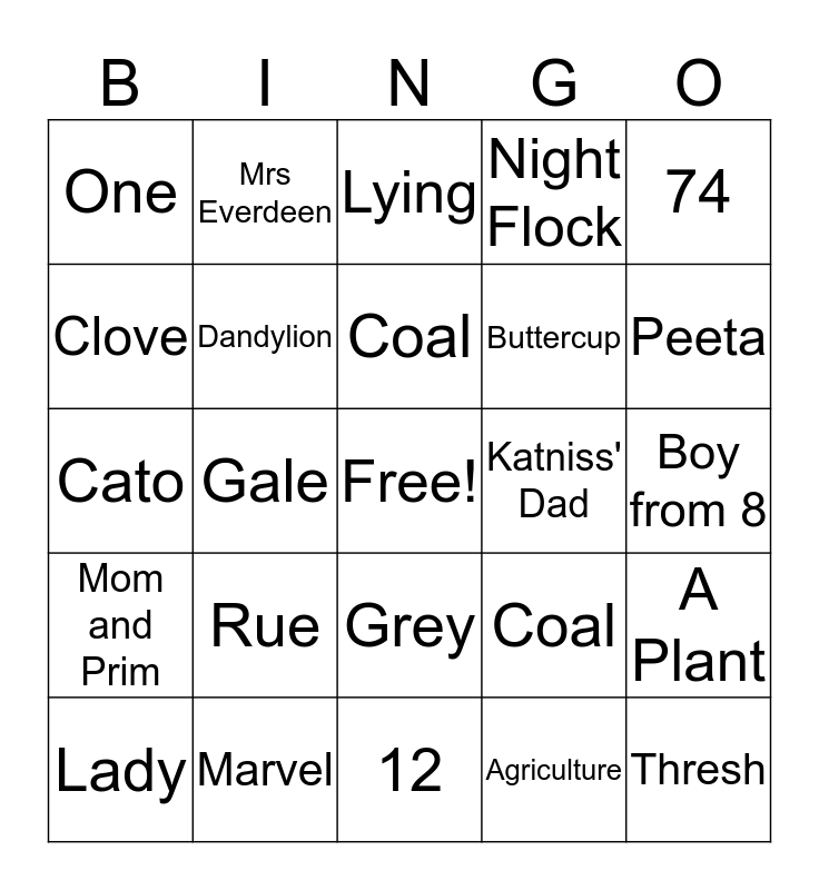 This bingo card has a free space and 24 words: Rue, Marvel, Coal, Lady, 74, One, Clove, Mrs Everdeen, Katniss' Dad, Grey, Buttercup, Cato, Coal, A Plant, Dandylion, Agriculture, Boy from 8, Lying, Peeta, Gale, Thresh, Mom and Prim, Night Flock and 12.
