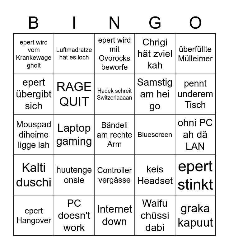 This bingo card has a free space and 24 words: huutenge onsie, PC doesn't work, Hadek schreit Switzerlaaaan, epert Hangover, überfüllte Mülleimer, epert wird vom Krankewage gholt, epert übergibt sich, Luftmadratze hät es loch, Bluescreen, Controller vergässe, Samstig am hei go, Mouspad diheime ligge lah, keis Headset, epert stinkt, RAGE QUIT, Waifu chüssi dabi, ohni PC ah dä LAN, epert wird mit Ovorocks beworfe, pennt underem Tisch, Laptop gaming, graka kapuut, Kalti duschi, Chrigi hät zviel kah and Internet down.