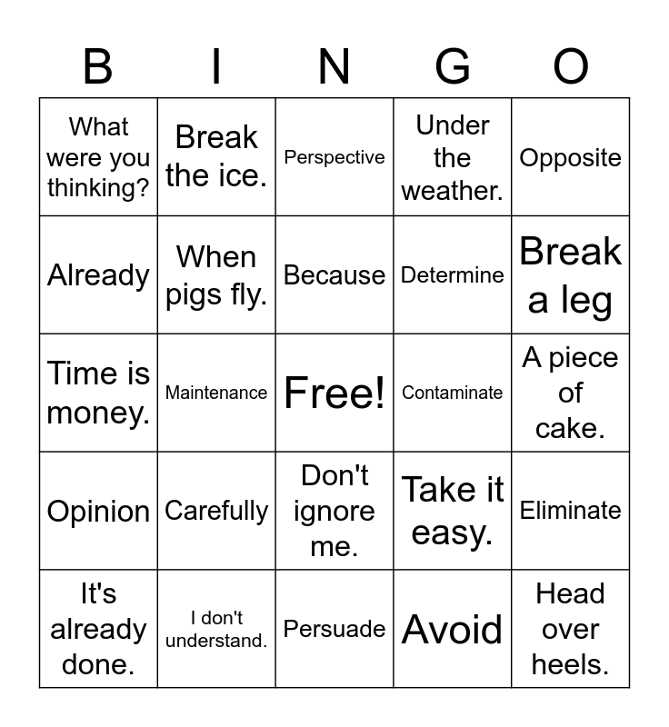 This bingo card has a free space and 24 words: Carefully, I don't understand., Because, It's already done., Opposite, What were you thinking?, Already, Break the ice., Contaminate, Don't ignore me., Determine, Time is money., Take it easy., Eliminate, When pigs fly., Avoid, A piece of cake., Perspective, Break a leg, Maintenance, Head over heels., Opinion, Under the weather. and Persuade.