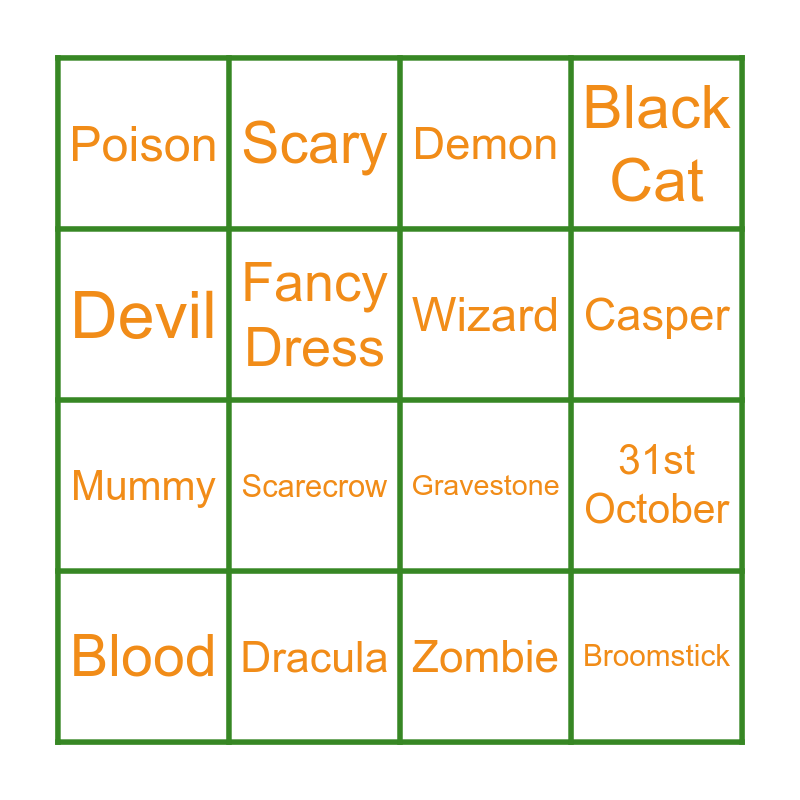 This bingo card has 64 words: Bats, Pumpkin, Halloween, Spooky, Sweeties, Trick or Treat, Scary, Ghost, Casper, Witch, Cobwebs, Spiders, Zombie, Devil, Potions, Fancy Dress, 31st October, Poison, Haunted, Mummy, Eyeballs, Broomstick, Black Cat, Frankenstein, Monsters, Aliens, Vampires, Werewolves, Curse, Skeleton, Boo!, Hocus Pocus, Ghoolies, Cauldron, Scarecrow, Bones, Shadows, Goblin, Coffin, Wizard, Gravestone, Dracula, Possessed, Cemetery, Afraid, Blood, Guts, Gore, Beast, Cackle, Cape, Carving, Chilling, Creepy, Cowboy, Corpse, Demon, Dark, Casket, Fangs, Fright, Fear, Fog and Moonlight.