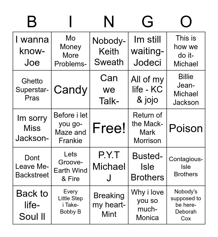 This bingo card has a free space and 24 words: Lets Groove- Earth Wind & Fire, Every Little Step i Take- Bobby B, Can we Talk-, Back to life-Soul ll, This is how we do it- Michael, I wanna know- Joe, Ghetto Superstar- Pras, Mo Money More Problems-, Return of the Mack-Mark Morrison, P.Y.T Michael J, All of my life - KC & jojo, Im sorry Miss Jackson-, Busted- Isle Brothers, Contagious- Isle Brothers, Candy, Why i love you so much- Monica, Poison, Nobody- Keith Sweath, Billie Jean- Michael Jackson, Before i let you go- Maze and Frankie, Nobody's supposed to be here- Deborah Cox, Dont Leave Me- Backstreet, Im still waiting- Jodeci and Breaking my heart- Mint.