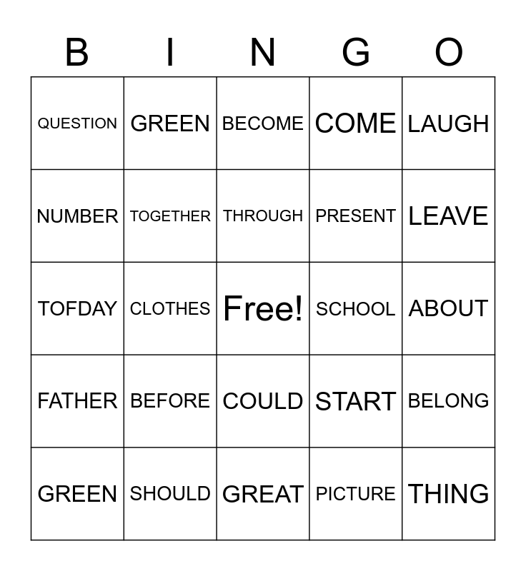 This bingo card has a free space and 29 words: GREEN, AGAIN, CLOTHES, SECOND, QUESTION, BECOME, TOGETHER, BEFORE, SCHOOL, SHOULD, ABOUT, THING, GREAT, PICTURE, LEAVE, BETWEEN, COULD, FATHER, LAUGH, TOFDAY, START, THESE, PRESENT, NUMBER, COME, GREEN, BELONG, THROUGH and THOUGHT.