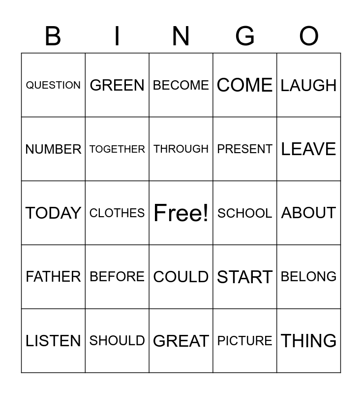 This bingo card has a free space and 29 words: LISTEN, AGAIN, CLOTHES, SECOND, QUESTION, BECOME, TOGETHER, BEFORE, SCHOOL, SHOULD, ABOUT, THING, GREAT, PICTURE, LEAVE, BETWEEN, COULD, FATHER, LAUGH, TODAY, START, THESE, PRESENT, NUMBER, COME, GREEN, BELONG, THROUGH and THOUGHT.