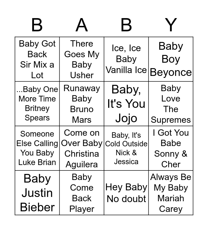 This bingo card has a free space and 15 words: Baby Justin Bieber, Always Be My Baby Mariah Carey, Ice, Ice Baby Vanilla Ice, Baby Got Back Sir Mix a Lot, Baby Love The Supremes, ...Baby One More Time Britney Spears, Come on Over Baby Christina Aguilera, Hey Baby No doubt, Runaway Baby Bruno Mars, Someone Else Calling You Baby Luke Brian, I Got You Babe Sonny & Cher, Baby Boy Beyonce, Baby, It's You Jojo, There Goes My Baby Usher and Baby Come Back Player.