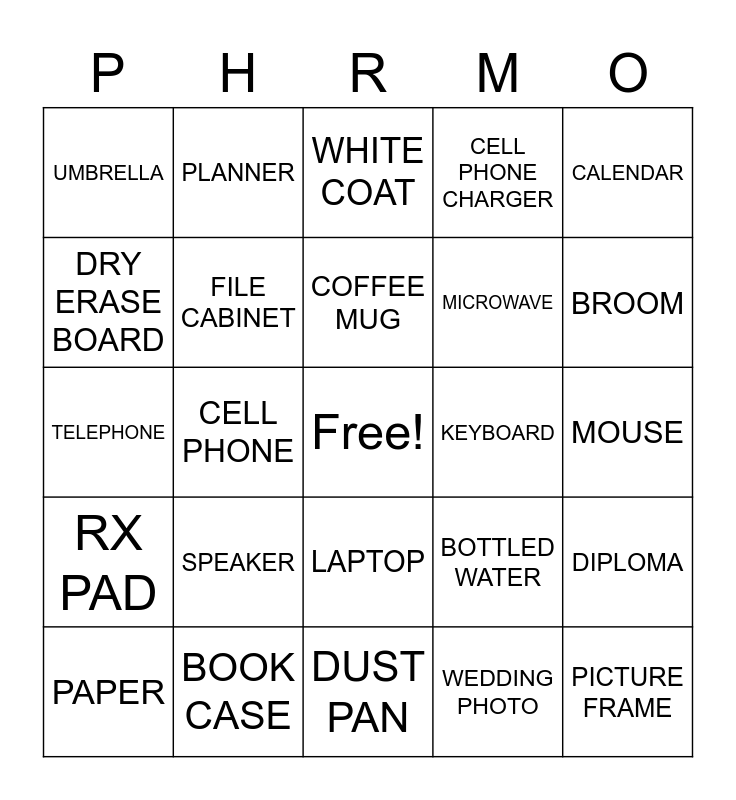 This bingo card has a free space and 40 words: STAPLER, TELEPHONE, HEADSET, FILE CABINET, BOOK CASE, LAPTOP, COFFEE MUG, PRINTER, CALENDAR, RX PAD, CELL PHONE, CELL PHONE CHARGER, PICTURE FRAME, MOUSE, KEYBOARD, SPEAKER, TRASH CAN, UMBRELLA, BOOK, WHITE COAT, DIPLOMA, WEDDING PHOTO, MICROWAVE, DRY ERASE BOARD, TISSUE, CAVI-WIPES, KEURIG, THUMB TACK, HAND SANITIZER, TAPE, PENS, PAPER, WHITE OUT, BOTTLED WATER, BROOM, DUST PAN, FOLDER, ORGANIZER, PLANNER and STICKY NOTE.