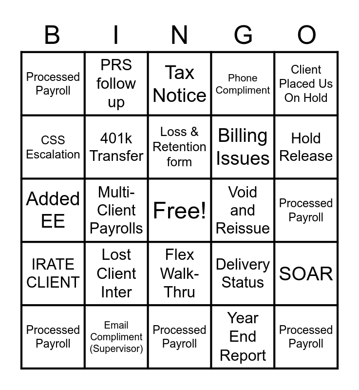 This bingo card has a free space and 24 words: Lost Client Inter, Email Compliment (Supervisor), Loss & Retention form, Processed Payroll, Client Placed Us On Hold, Processed Payroll, CSS Escalation, PRS follow up, Void and Reissue, Flex Walk-Thru, Billing Issues, Added EE, Delivery Status, SOAR, 401k Transfer, Year End Report, Processed Payroll, Tax Notice, Hold Release, Multi-Client Payrolls, Processed Payroll, IRATE CLIENT, Phone Compliment and Processed Payroll.
